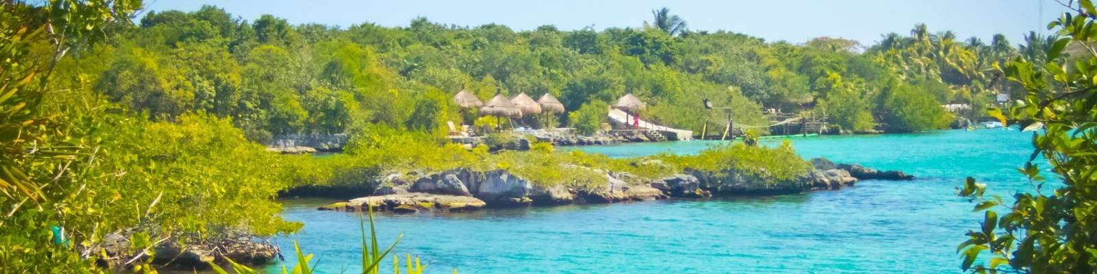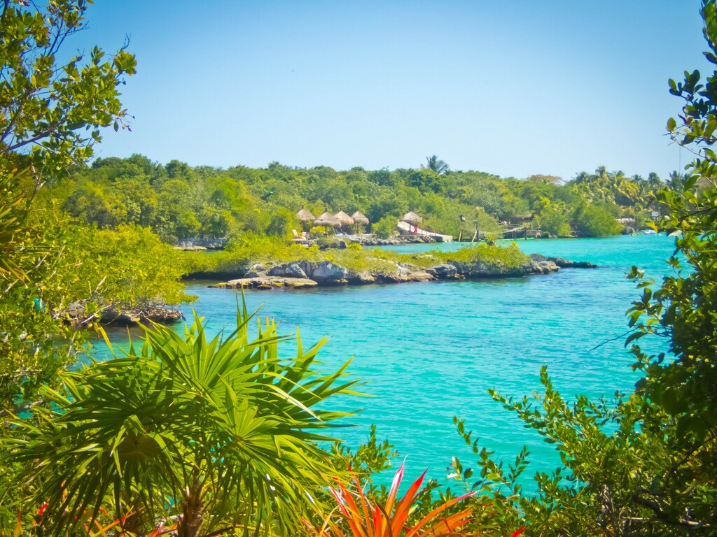 Seven-coloured lagoon and tropical plants in Bacalar