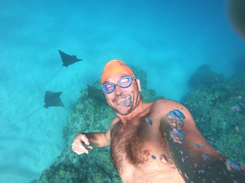 Simon swimming with rays in Hawaii