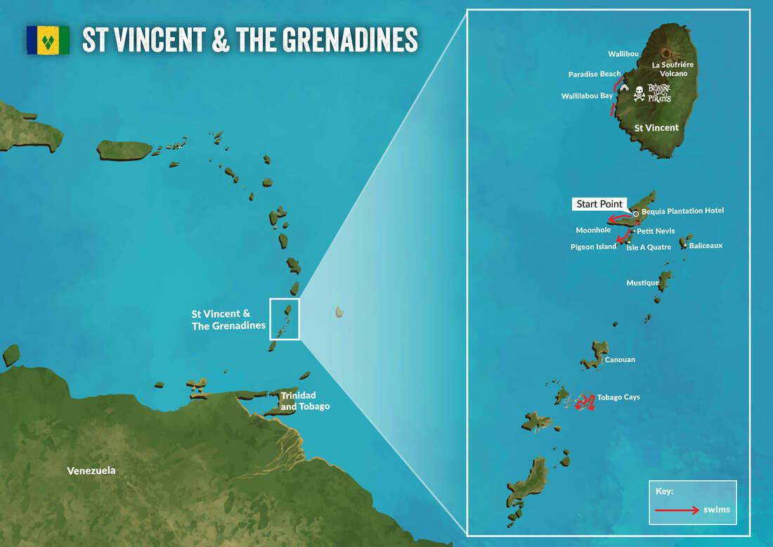We’ll keep you away from the tourist bustle of distant lands, seeking out deserted islets and warm waters that invite swimmers year-round. Hike on mountain trails, plunge into lush rainforests and gawp at volcanic peaks as well, like La Soufrière. Prepare for spectacular swims and plenty of exploration as explore as much of the islands as possible during the trip. First we begin your swim adventure on the island of St Vincent with the rugged coastline. Later, we travel south through the Grenadines to the far-flung Tobago Cays. This is a swimmer’s paradise replete with clear waters and host to turtles that graze the sea grass and coral reefs.